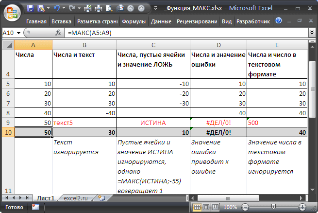 Еще одна частая ошибка — непонимание различий между функциями МАКС и МАКСА. В то время как МАКС работает только с числами, функция МАКСА учитывает логические значения (TRUE и FALSE), интерпретируя их как 1 и 0 соответственно. Если вы случайно используете МАКСА вместо МАКС, это может привести к искажению результатов, особенно если в данных присутствуют логические значения.